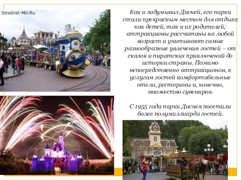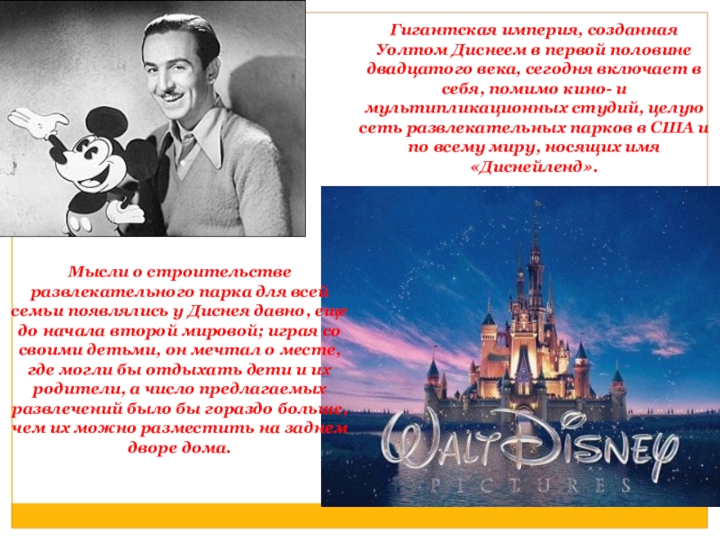 Мысли о строительстве развлекательного парка для всей семьи появлялись у Диснея давно, еще до начала второй мировой; играя со своими детьми, он мечтал о месте, где могли бы отдыхать дети и их родители, а число предлагаемых развлечений было бы гораздо больше, чем их можно разместить на заднем дворе дома.