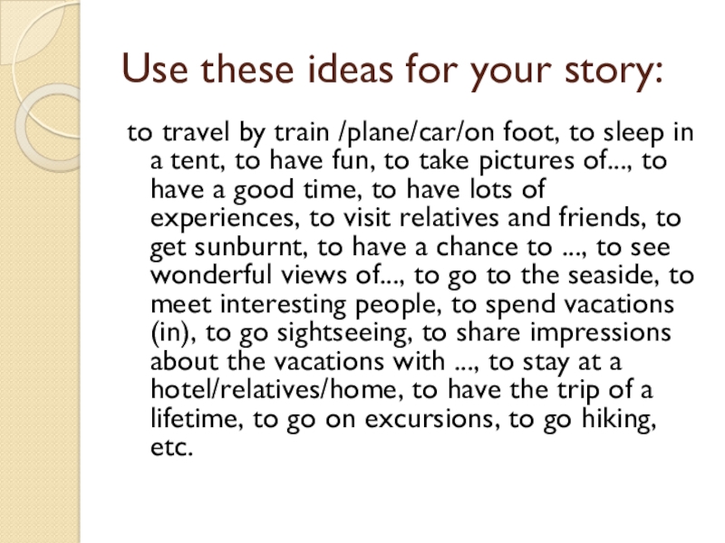 Use these ideas for your story:to travel by train /plane/car/on foot, to sleep in a tent, to