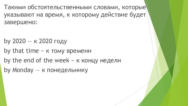 Слайд 27Такими обстоятельственными словами, которые указывают на время, к которому действие будет