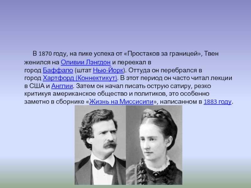 «Простаков за границей», Твен женился на Оливии Лэнгдон и переехал в город Баффало (штат Нью-Йорк). Оттуда он перебрался в город Хартфорд (Коннектикут). В этот период он часто читал лекции в США и Англии. Затем он начал писать острую сатиру, резко критикуя американское общество и политиков, это особенно заметно в сборнике «Жизнь на Миссисипи», написанном в 1883 году.