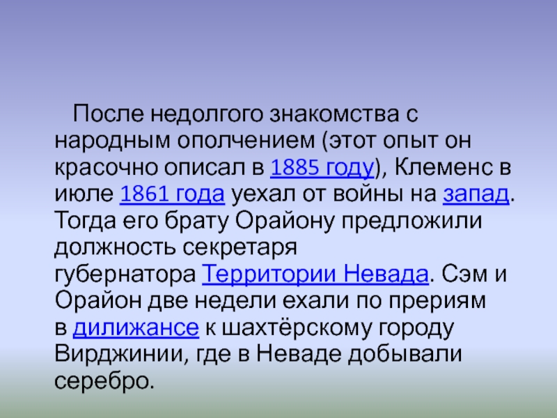 опыт он красочно описал в 1885 году), Клеменс в июле 1861 года уехал от войны на запад. Тогда его брату Орайону предложили должность секретаря губернатора Территории Невада. Сэм и Орайон две недели ехали по прериям в дилижансе к шахтёрскому городу Вирджинии, где в Неваде добывали серебро.