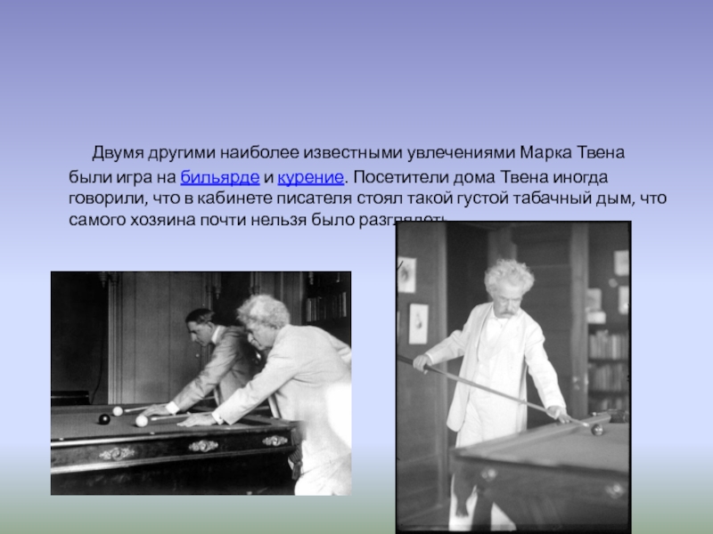 были игра на бильярде и курение. Посетители дома Твена иногда говорили, что в кабинете писателя стоял такой густой табачный дым, что самого хозяина почти нельзя было разглядеть.