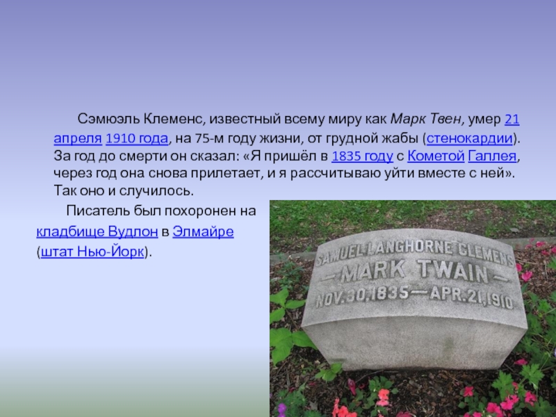 Кле́менс; 30 ноября 1835 года, посёлок Флорида,Миссури, США — 21 апреля 1910 года, Реддинг, Коннектикут, США) — американский писатель, журналист и общественный деятель. Его творчество охватывает