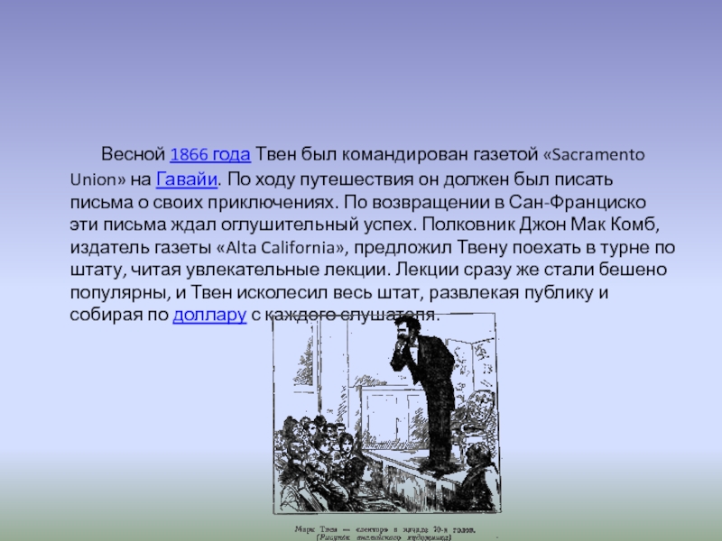 на Гавайи. По ходу путешествия он должен был писать письма о своих приключениях. По возвращении в Сан-Франциско эти письма ждал оглушительный успех. Полковник Джон Мак Комб, издатель газеты «Alta California», предложил Твену поехать в турне по штату, читая увлекательные лекции. Лекции сразу же стали бешено популярны, и Твен исколесил весь штат, развлекая публику и собирая по доллару с каждого слушателя.