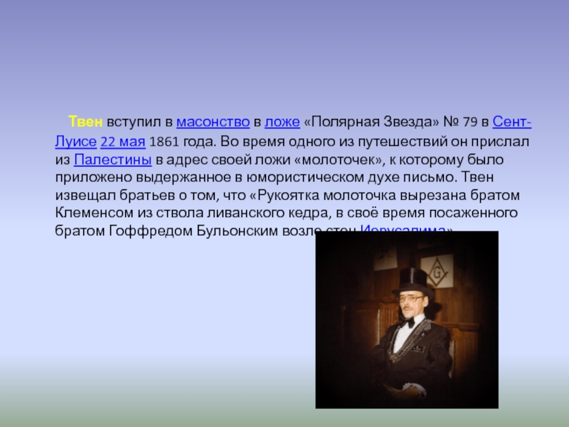 Слайд 9 Твен вступил в масонство в ложе «Полярная Звезда» № 79 в Сент-Луисе 22 мая 1861 года.