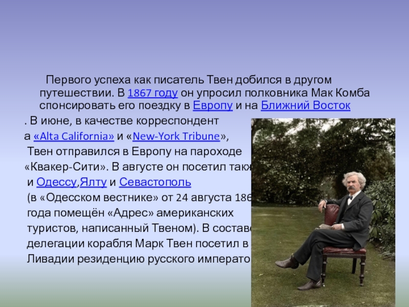 другом путешествии. В 1867 году он упросил полковника Мак Комба спонсировать его поездку в Европу и на Ближний Восток