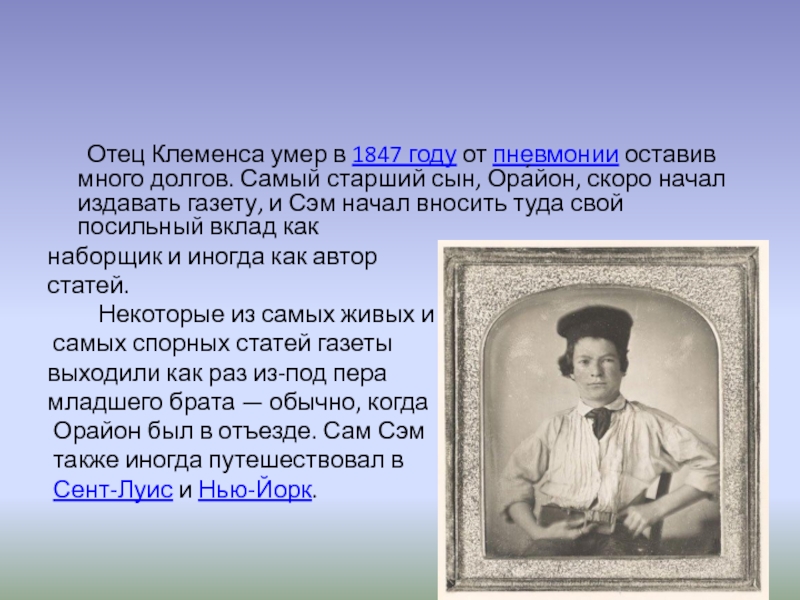 Слайд 7 Отец Клеменса умер в 1847 году от пневмонии оставив много
