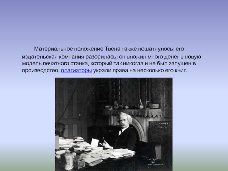 Слайд 22 Материальное положение Твена также пошатнулось: его