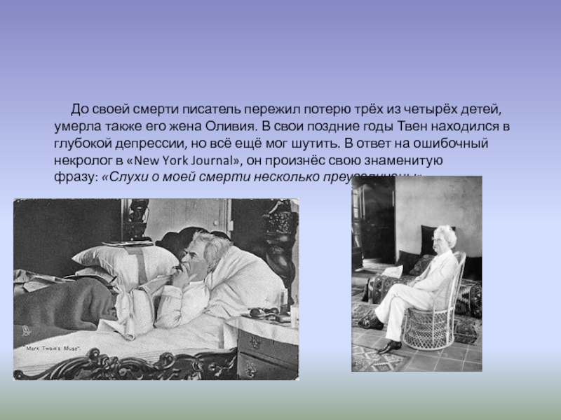 потерю трёх из четырёх детей, умерла также его жена Оливия. В свои поздние годы Твен находился в глубокой депрессии, но всё ещё мог шутить. В ответ на ошибочный некролог в «New York Journal», он произнёс свою знаменитую фразу: «Слухи о моей смерти несколько преувеличены».