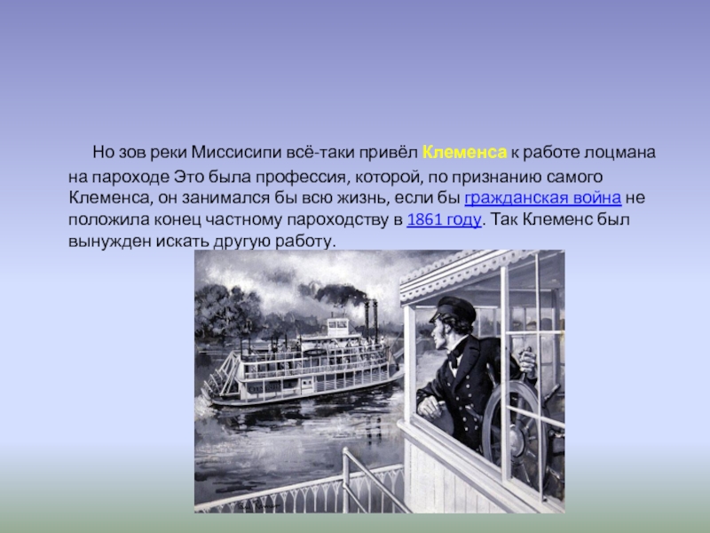 к работе лоцмана на пароходе Это была профессия, которой, по признанию самого Клеменса, он занимался бы всю жизнь, если бы гражданская война не положила конец частному пароходству в 1861 году. Так Клеменс был вынужден искать другую работу.