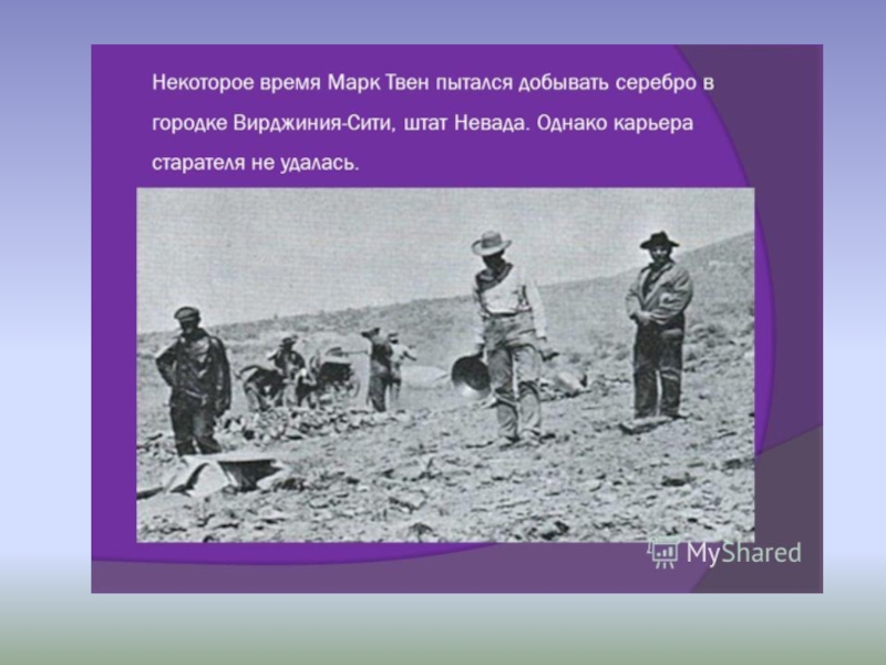 Твена как писателя и лёг в основу его второй книги. В Неваде, надеясь разбогатеть, Сэм Клеменс стал шахтёром и начал добывать серебро. Ему приходилось подолгу жить в лагере вместе с другими старателями — этот образ жизни он позже описал в литературе. Но Клеменс не смог стать удачливым старателем, ему пришлось оставить добычу серебра и устроиться работать в газету «Territorial Enterprise» там же,