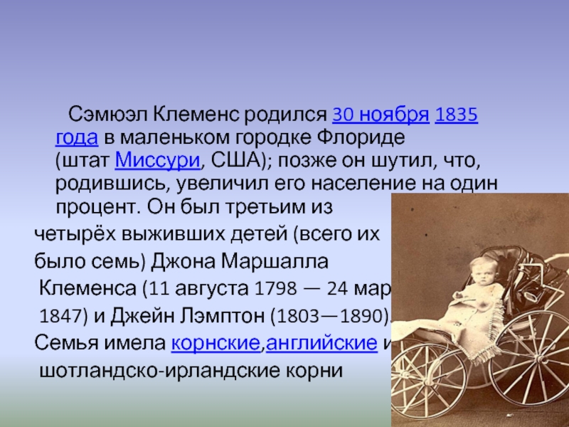 Слайд 6 Сэмюэл Клеменс родился 30 ноября 1835 года в маленьком городке