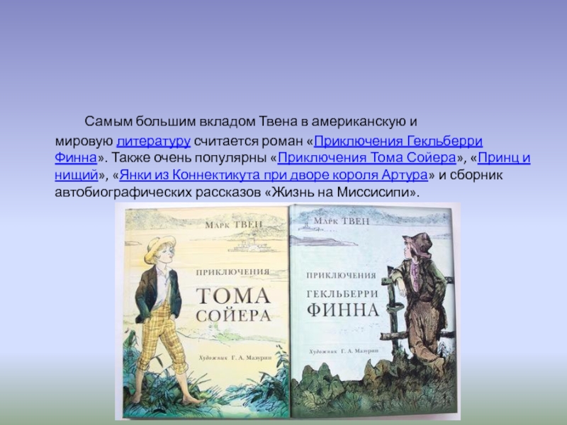 и мировую литературу считается роман «Приключения Гекльберри Финна». Также очень популярны «Приключения Тома Сойера», «Принц и нищий», «Янки из Коннектикута при дворе короля Артура» и сборник автобиографических рассказов «Жизнь на Миссисипи».