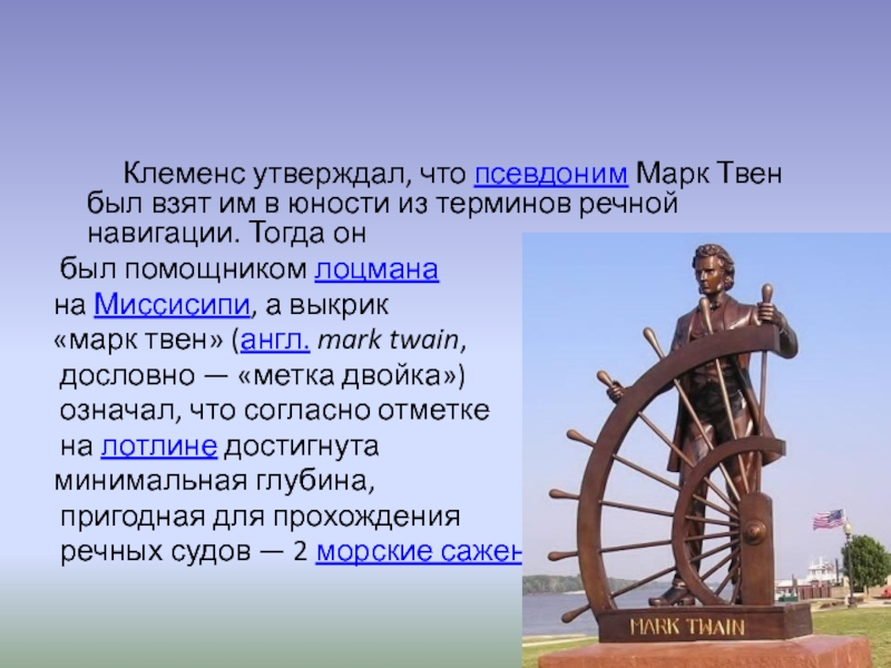 Слайд 4 Клеменс утверждал, что псевдоним Марк Твен был взят