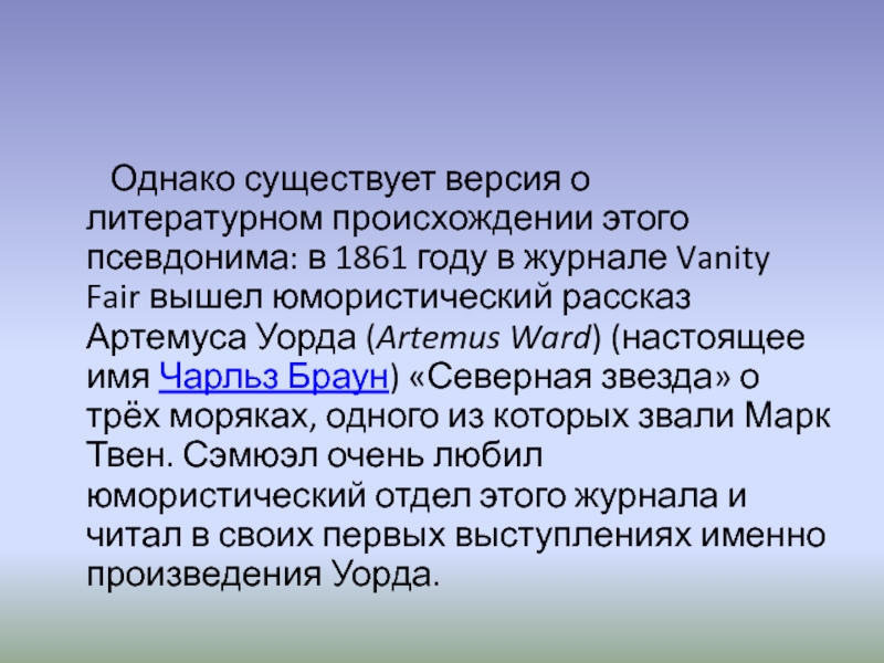 псевдонима: в 1861 году в журнале Vanity Fair вышел юмористический рассказ Артемуса Уорда (Artemus Ward) (настоящее имя Чарльз Браун) «Северная звезда» о трёх моряках, одного из которых звали Марк Твен. Сэмюэл очень любил юмористический отдел этого журнала и читал в своих первых выступлениях именно произведения Уорда.
