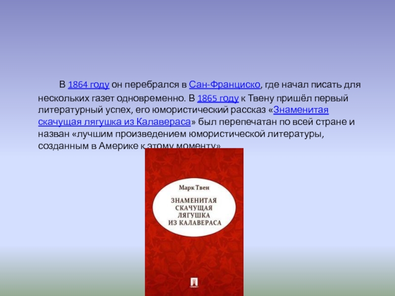 писать для нескольких газет одновременно. В 1865 году к Твену пришёл первый литературный успех, его юмористический рассказ «Знаменитая скачущая лягушка из Калавераса» был перепечатан по всей стране и назван «лучшим произведением юмористической литературы, созданным в Америке к этому моменту».
