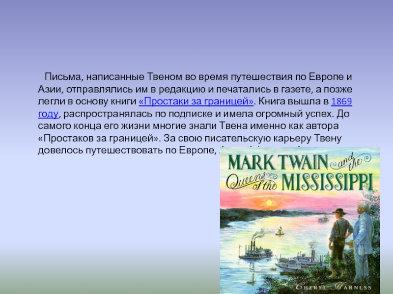 по Европе и Азии, отправлялись им в редакцию и печатались в газете, а позже легли в основу книги «Простаки за границей». Книга вышла в 1869 году, распространялась по подписке и имела огромный успех. До самого конца его жизни многие знали Твена именно как автора «Простаков за границей». За свою писательскую карьеру Твену довелось путешествовать по Европе, Азии, Африке и Австралии.