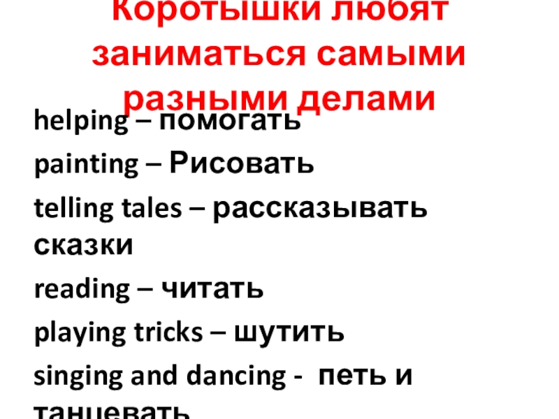 Коротышки любят заниматься самыми разными деламиhelping – помогатьpainting – Рисовать telling tales – рассказывать сказкиreading – читатьplaying
