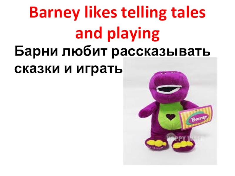 Barney likes telling tales and playingБарни любит рассказывать сказки и играть.