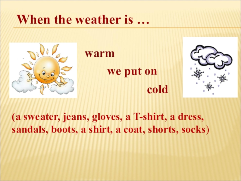 (a sweater, jeans, gloves, a T-shirt, a dress, sandals, boots, a shirt, a coat, shorts, socks)