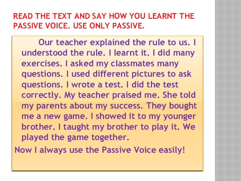 Our teacher explained the rule to us. I understood the rule. I learnt it. I did many exercises. I asked my classmates many questions. I used different pictures to ask questions. I wrote a test. I did the test correctly. My teacher praised me. She told my parents about my success. They bought me a new game. I showed it to my younger brother. I taught my brother to play it. We played the game together.