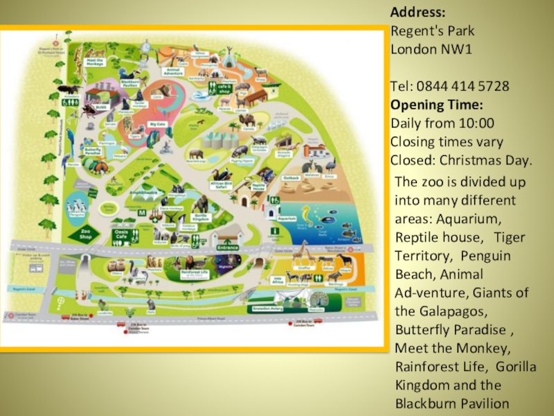 The zoo is divided up into many different areas: Aquarium, Reptile house, Tiger Territory, Penguin Beach, Animal Ad-venture, Giants of the Galapagos, Butterfly Paradise , Meet the Monkey, Rainforest Life, Gorilla Kingdom and the Blackburn Pavilion