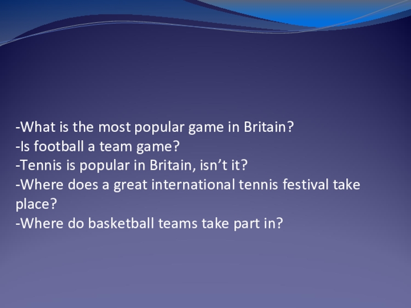 Tennis is very popular in Britain too. Most English parks have tennis courts. Every summer a great international tennis festival takes place at Wimbledon near London.