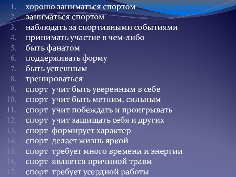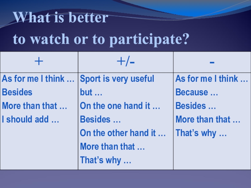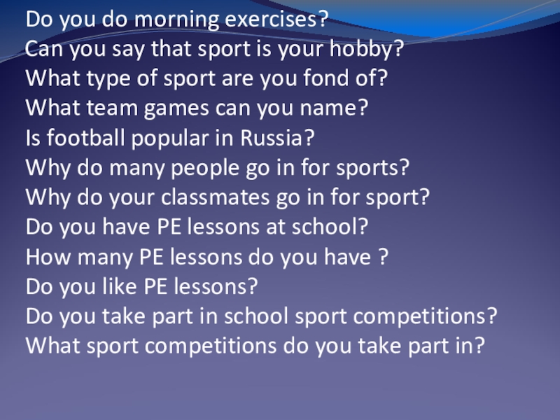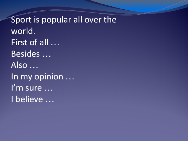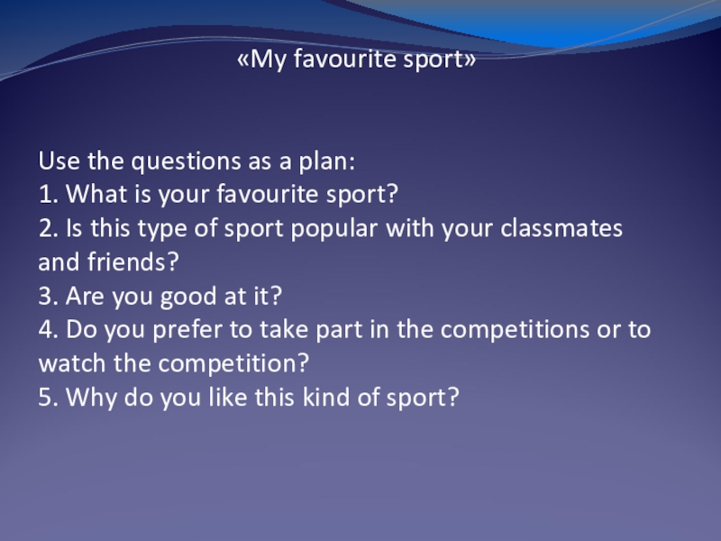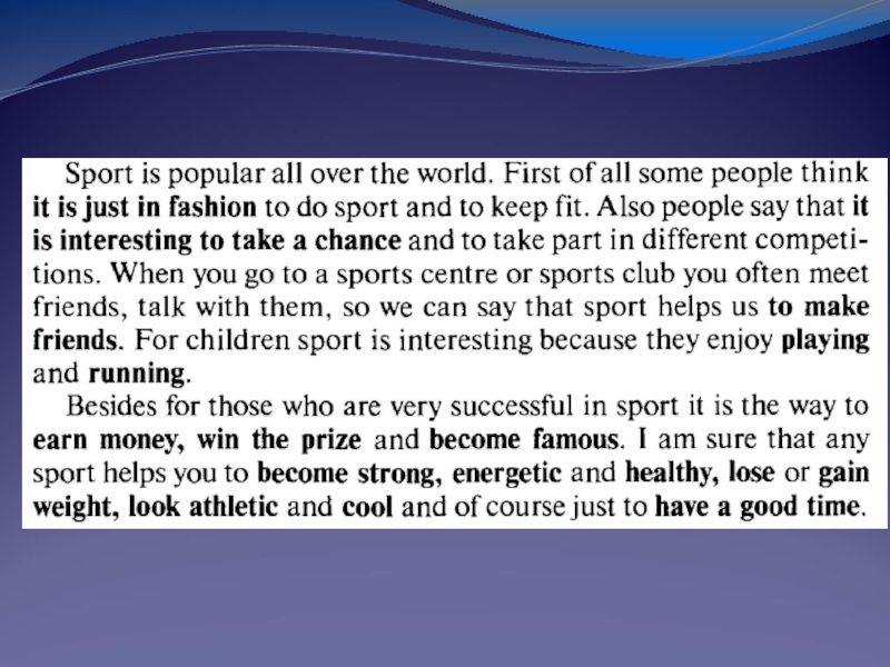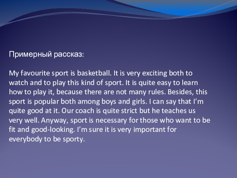watch and to play this kind of sport. It is quite easy to learn how to play it, because there are not many rules. Besides, this sport is popular both among boys and girls. I can say that I’m quite good at it. Our coach is quite strict but he teaches us very well. Anyway, sport is necessary for those who want to be fit and good-looking. I’m sure it is very important for everybody to be sporty.