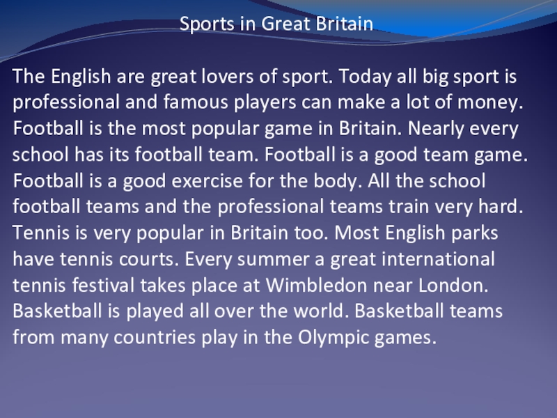 all big sport is professional and famous players can make a lot of money. Football is the most popular game in Britain. Nearly every school has its football team. Football is a good team game. Football is a good exercise for the body. All the school football teams and the professional teams train very hard.