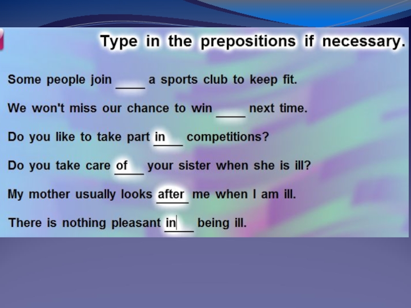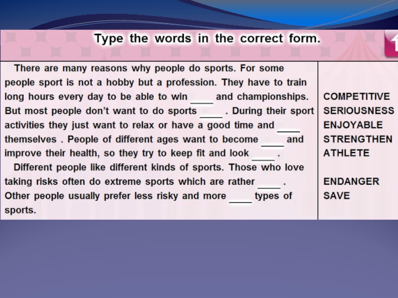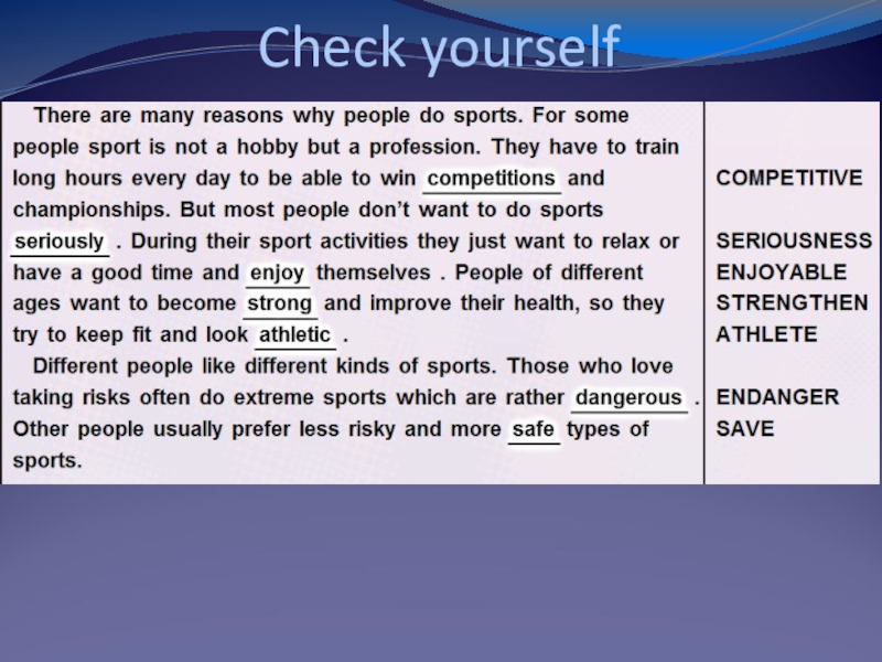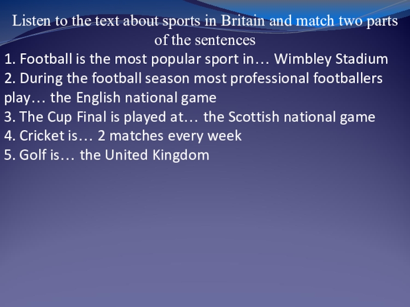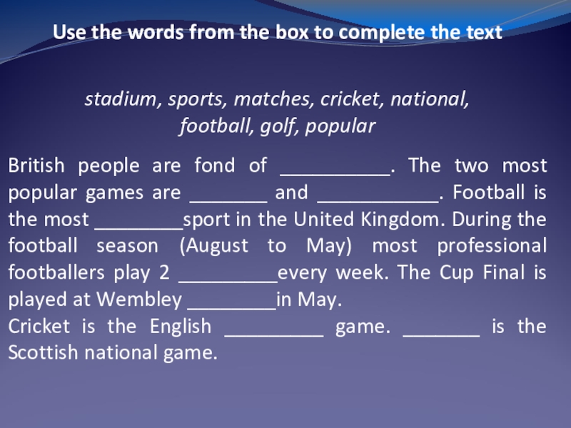 British people are fond of __________. The two most popular games are _______ and ___________. Football is the most ________sport in the United Kingdom. During the football season (August to May) most professional footballers play 2 _________every week. The Cup Final is played at Wembley ________in May.