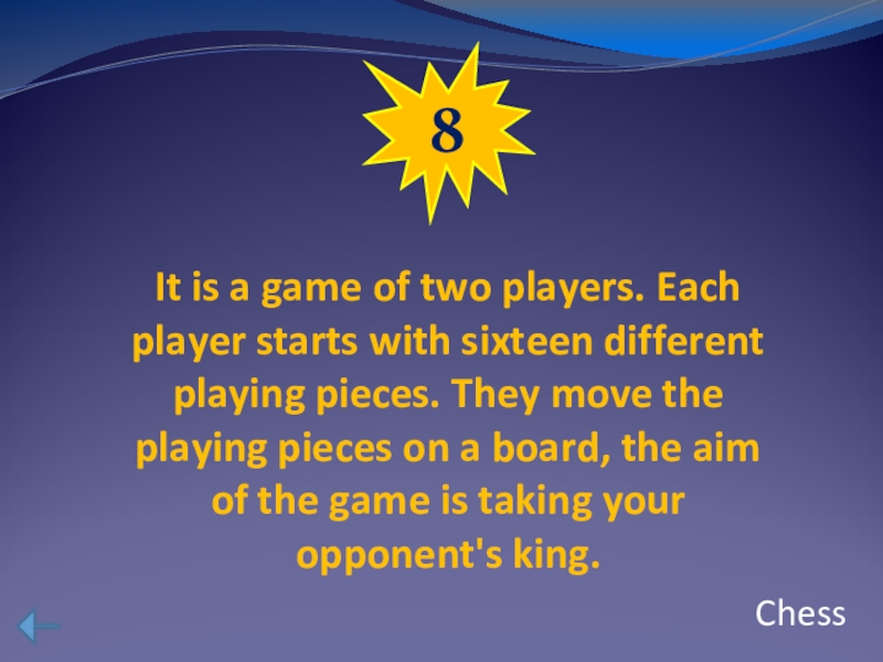 sixteen different playing pieces. They move the playing pieces on a board, the aim of the game is taking your opponent's king.