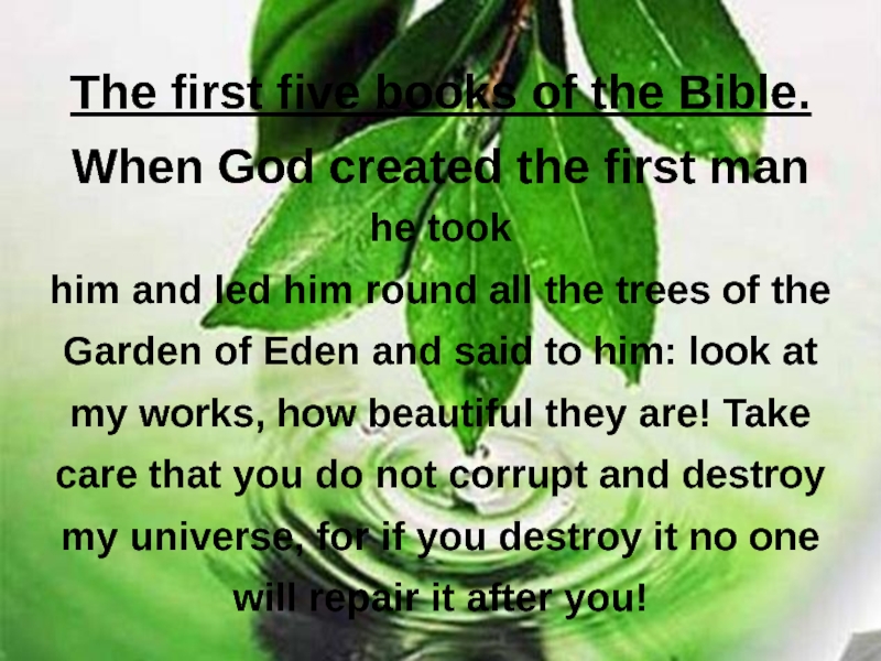 The first five books of the Bible.When God created the first man he tookhim and led him round all the trees of theGarden of Eden and said to him: look atmy works, how beautiful they are!