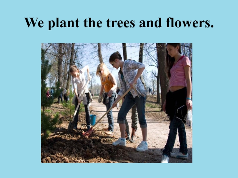 Слайд 20We plant the trees and flowers.