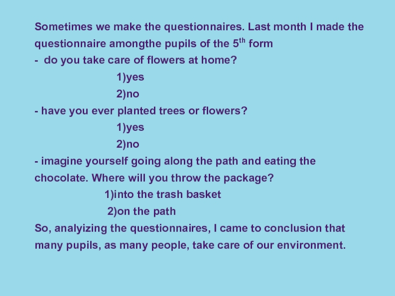 So, analyizing the questionnaires, I came to conclusion that many pupils, as many people, take care of our environment.