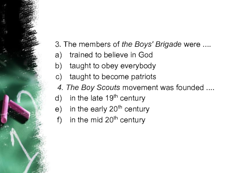 3. The members of the Boys' Brigade were ....trained to believe in Godtaught to obey