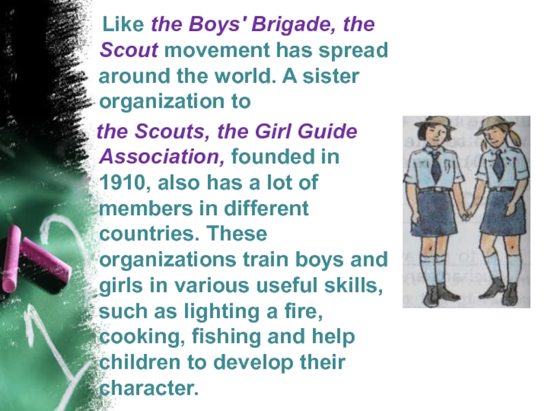 the Scouts, the Girl Guide Association, founded in 1910, also has a lot of members in different countries. These organizations train boys and girls in various useful skills, such as lighting a fire, cooking, fishing and help children to develop their character.