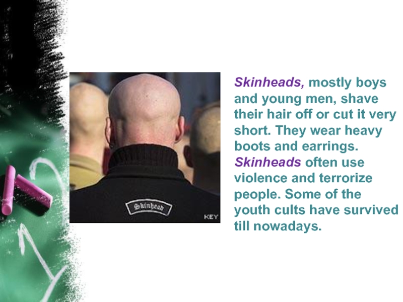 shave their hair off or cut it very short. They wear heavy boots and earrings. Skinheads often use violence and terrorize people. Some of the youth cults have survived till nowadays.