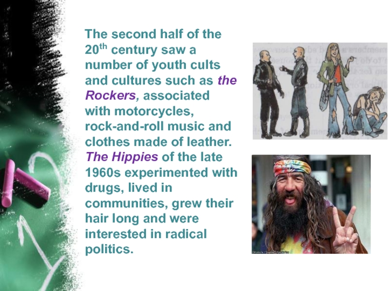 a number of youth cults and cultures such as the Rockers, associated with motorcycles, rock-and-roll music and clothes made of leather. The Hippies of the late 1960s experimented with drugs, lived in communities, grew their hair long and were interested in radical politics.