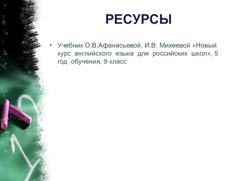 РЕСУРСЫУчебник О.В.Афанасьевой, И.В. Михеевой «Новый курс английского языка для российских школ», 5 год обучения, 9 класс