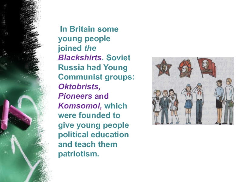 In Britain some young people joined the Blackshirts. Soviet Russia had Young Communist groups: