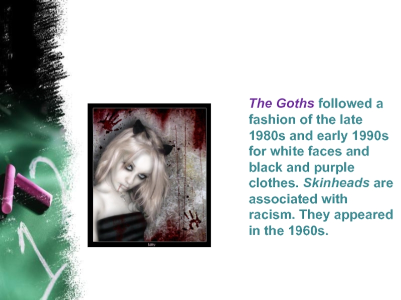 fashion of the late 1980s and early 1990s for white faces and black and purple clothes. Skinheads are associated with racism. They appeared in the 1960s.