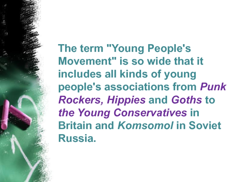 The term "Young People's Movement" is so wide that it includes all kinds of young people's associations from Punk Rockers, Hippies and Goths to the Young Conservatives in Britain and Komsomol in Soviet Russia.