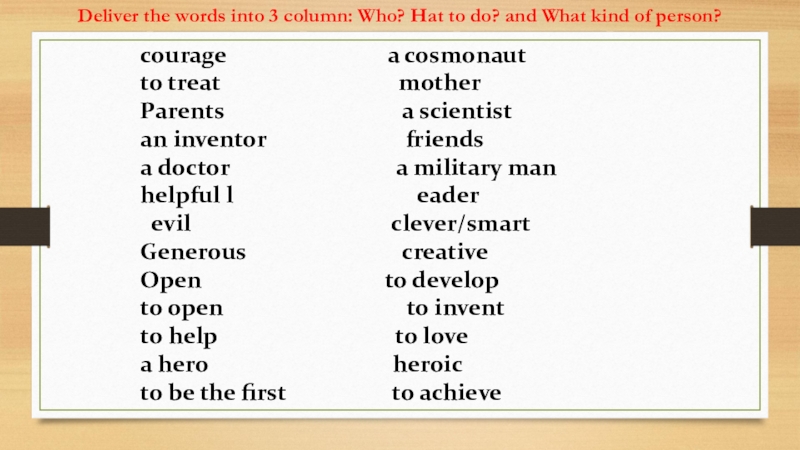 Deliver the words into 3 column: Who? Hat to do? and What kind of person?
