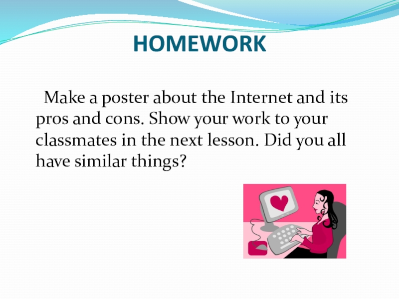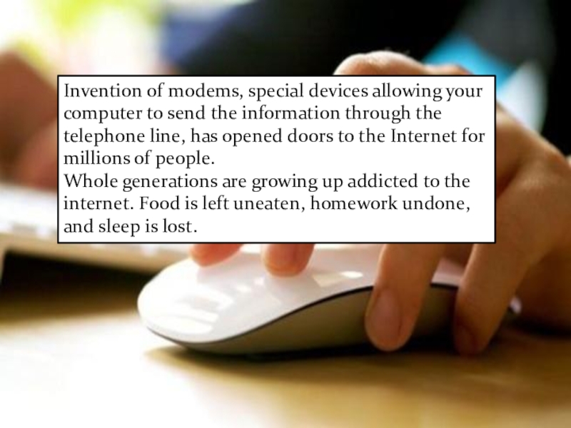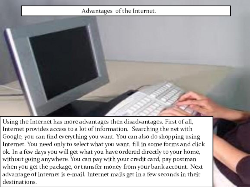 Using the Internet has more advantages then disadvantages. First of all, Internet provides access to a lot of information. Searching the net with Google, you can find everything you want. You can also do shopping using Internet. You need only to select what you want, fill in some forms and click ok. In a few days you will get what you have ordered directly to your home, without going anywhere. You can pay with your credit card, pay postman when you get the package, or transfer money from your bank account. Next advantage of internet is e-mail. Internet mails get in a few seconds in their destinations.
