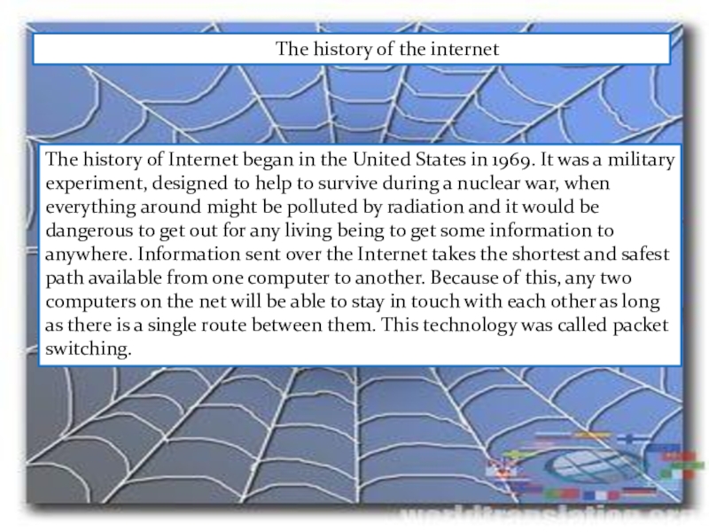 The history of Internet began in the United States in 1969. It was a military experiment, designed to help to survive during a nuclear war, when everything around might be polluted by radiation and it would be dangerous to get out for any living being to get some information to anywhere. Information sent over the Internet takes the shortest and safest path available from one computer to another. Because of this, any two computers on the net will be able to stay in touch with each other as long as there is a single route between them. This technology was called packet switching.