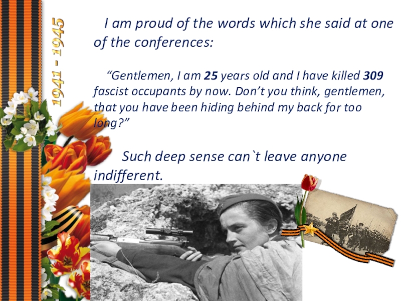 With immense pride I`d like to tell you Lieutenant Pavlichenko killed 257 German soldiers. Her total number of confirmed kills during World War II was 309 German soldiers, including 36 enemy snipers.