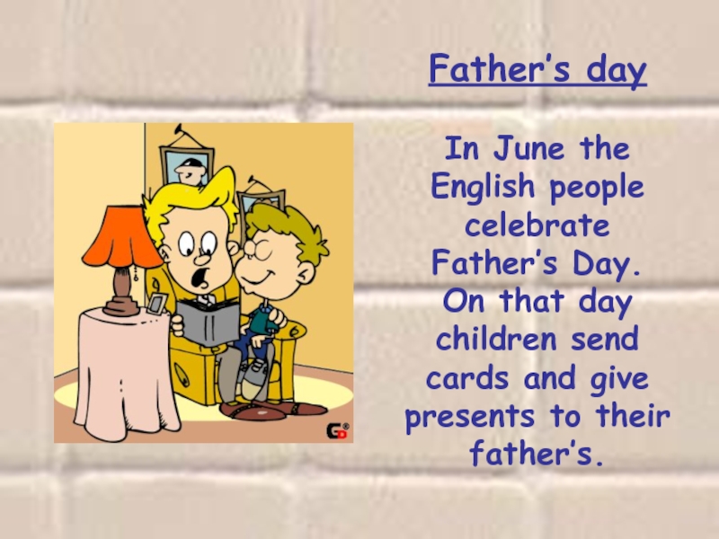 Father’s day  In June the English people celebrate Father’s Day. On that day children send cards and