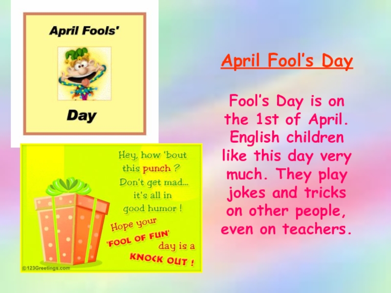 April Fool’s DayFool’s Day is on the 1st of April. English children like this day very much.