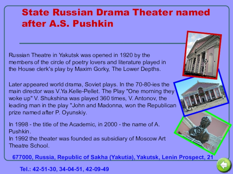 Later appeared world drama, Soviet plays. In the 70-80-ies the main director was V.Ya.Kelle-Pellet. The Play "One morning they woke up" V. Shukshina was played 360 times, V. Antonov, the leading man in the play "John and Madonna, won the Republican prize named after P. Oyunskiy.