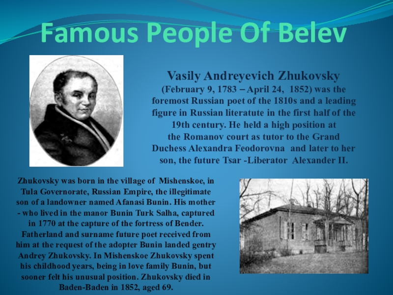 Zhukovsky was born in the village of Mishenskoe, in Tula Governorate, Russian Empire, the illegitimate son of a landowner named Afanasi Bunin. His mother - who lived in the manor Bunin Turk Salha, captured in 1770 at the capture of the fortress of Bender. Fatherland and surname future poet received from him at the request of the adopter Bunin landed gentry Andrey Zhukovsky. In Mishenskoe Zhukovsky spent his childhood years, being in love family Bunin, but sooner felt his unusual position. Zhukovsky died in Baden-Baden in 1852, aged 69.